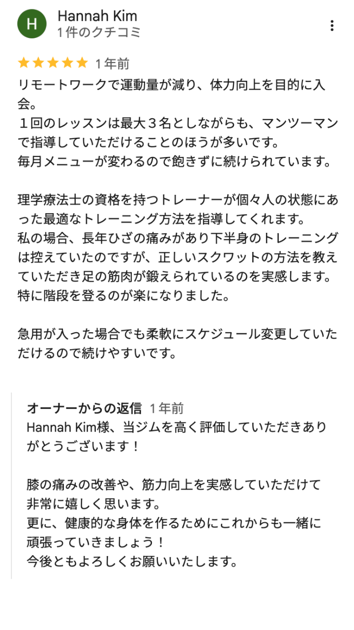 当ジムは固定曜日・時間制ですが、事前にご連絡いただければ他の枠に振替できます。お仕事やご家庭の都合にも対応しやすいシステムです。振替の期限についても"翌月いっぱいまで"と余裕がございますのでご安心ください。